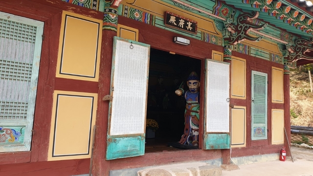대웅전 옆의 명부전은 중앙에 지장보살을 두고 좌우 도명존자, 무독귀왕, 각 지옥을 관장하는 대왕들이 자리하고 있습니다. 1976년에 보수한 명부전입니다. 입구에 서 있는 지장보살을 수호하는 금강역사의 모습이 위압적입니다. 왠지 한 대 쥐어박을 것 같은 착각에 얼른 발걸음을 옮겼습니다.