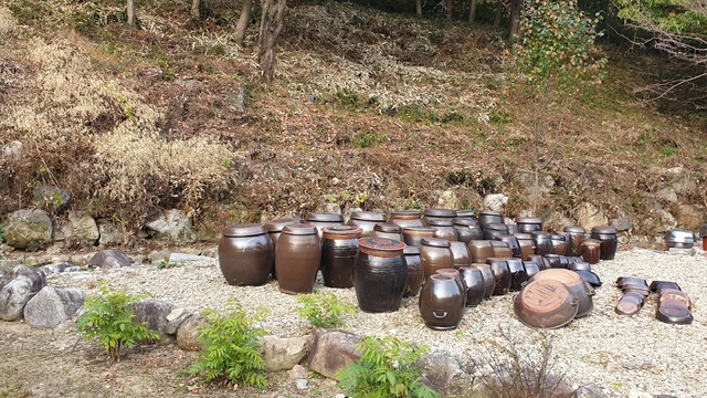 요사채의 장독대가 양지바른 곳에 가을 햇살을 머금고 있습니다. 나란히 줄 맞춰 놓여있는 장독 뚜껑이 이채롭습니다. 1972년에 요사채는 보수되었다고 해요.