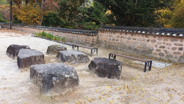 의자처럼 놓여 있는 여섯 개의 바위가 운치가 있습니다. 떨어지는 은행잎을 바라보며 따뜻한 차 한잔 먹으면 더욱더 좋을 것 같습니다. 단정하고 소박한 천황사에서는 가을을 만끽해 볼 수 있는 편안함이 있었습니다.