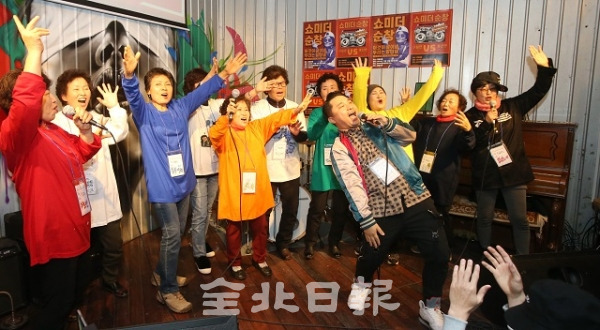 지난 15일 순창군 할머니들의 랩 배틀인 '쇼미더 순창'이 순창군 교성리 방랑싸롱에서 열린 가운데 풍산면 할머니들이 갈고닦은 랩 실력을 뽐내고 있다. 조현욱 기자