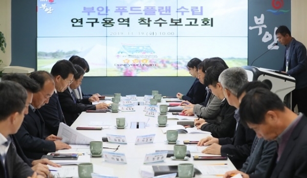 부안군은 19일 권익현 군수 주재로 관련 부서장과 푸드플랜 실무협의 TF팀 등 30여명이 참석한 가운데 푸드플랜 수립 연구용역 착수보고회를 갖고 먹거리 종합전략 수립에 본격 돌입했다. 이 계획은 지역농업에 대한 현황을 진단하고 지역에 적합한 농업발전 방안과 지역 내 농산물 순환시스템을 구축하는 사업이다.이번 연구용역을 통해 지역의 먹거리 현황을 정확히 파악해 통합적인 푸드시스템을 구축함으로써 타 시군과 차별화된 부안군 맞춤형 먹거리 종합계획을 수립할 방침이다. 이날 착수보고회를 시작으로 오는 2020년 4월까지 약 6개월 동안 진행되는 이번 연구용역을 통해 부안형 푸드플랜 계획 수립, 푸드통합지원센터 설립 및 운영 타당성 검토, 중장기 로드맵 구축, 푸드플랜 운영 주체 구성 방안, 지속가능한 먹거리정책 수행을 위한 민관협치 거버넌스 운영 지원, 부안 지역푸드를 활용한 연계사업 발굴 등을 추진할 계획이다.