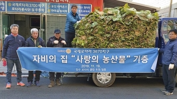 한편 장수로타리클럽은 2004년 12월 대구 태양로타리클럽(3700지구)과 자매 결연을 맺고 연 2회 합동산행 및 친목 교류행사를 하고 있으며, 사랑의 농산물 전달은 2014년 강경석 회원의 ‘사랑의 배추’ 전달이 시발점이 되어 6년째 클럽 회원들이 동참해, 직접 생산한 농산물을 기증하고 있다.