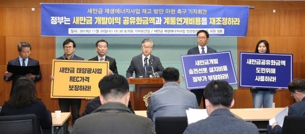 새만금재생에너지사업 민관협의회 민측위원 일동은 20일 전북도의회 브리핑룸에서 기자회견을 열고 “송전선로 계통연계비용은 최초 6600억에서 1700억이 늘어난 8300억으로 변경됐는데, 이는 5조원 남짓 규모인 총사업비의 16%를 차지하는 막대한 액수”라고 밝혔다.