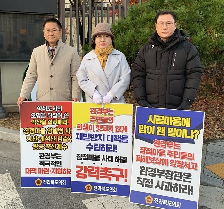 20일 도의회 최영규(익산4) 의원을 비롯해 김정수(익산2) 의원, 최영심(비례) 의원은 세종시 환경부 정문 앞에서 “정부가 장점마을 인근 비료공장과 암 발병의 연관성을 인정했기 때문에 이에 대한 해결을 적극적으로 추진하라”며 피켓시위를 진행했다.