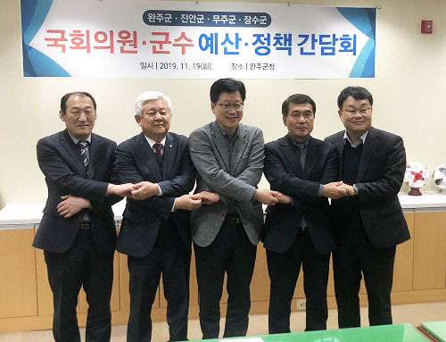안 의원과 박성일 완주군수, 황인홍 무주군수, 장영수 장수군수, 최성용 진안군수 권한대행은 지난 19일 완주군청에서 예산·정책 간담회를 가졌다.