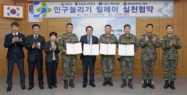 익산시는 27일 익산시청에서 육군부사관학교와 7공수 특전여단, 제9585부대 3대대 등 3개 군부대와 인구 늘리기 실천 협약을 체결했다.