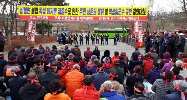 완주군 비봉면폐기물대책위는 27일 완주군청 광장에서 완주적폐청산행동연대와 공동으로 ’비봉면불법독성폐기물침출수로 인한 주민 생존권 쟁취 및 박성일 군수 규탄 결의대회’를 열고 “완주군은 당장 고화토 독성폐기물을 걷어내라”고 요구했다.