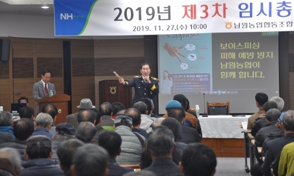 남원경찰서는 지난 27일 남원농협 회의실에서 농협 대의원 180명이 참석한 가운데, 판소리 버전으로 ‘국민을 위한 인권보호 다짐’ 홍보활동을 벌였다.