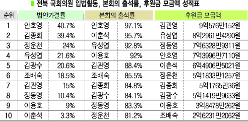 법안 가결률 안호영 97.1% 1등, 이춘석 3,3% 꼴찌