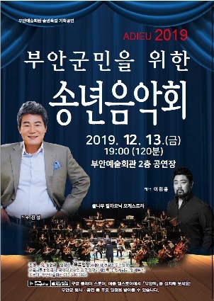부안군은 오는 13일 오후 7시 부안예술회관 공연장에서 2019년 송년특집 기획공연 ‘ADIEU 2019년 부안군민을 위한 송년음악회’를 개최한다.이번 공연은 군민들이 올 한 해를 뜻깊게 마무리하고 새로운 새해를 맞이할 수 있도록 하기 위해 마련됐다.공연은 부안 출신 개그맨 겸 가수 김종석씨의 사회로 가수 진성·하태웅씨, 테너 이원용씨, 부안상주단체 클나무 필하모닉 오케스트라, 개그맨 겸 가수 김종하씨, 가수 태민씨, 가수 진정아씨, 걸그룹 레이디티, 이카루스 댄스팀 등이 수준 높은 공연을 선보일 예정이다. 한편 이번 공연은 전 연령 입장이 가능하고 전석 무료이며 기타 자세한 사항은 부안예술회관(580-3924)으로 문의하면 된다.