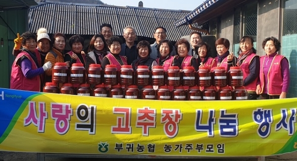 부귀농협 농가주부모임은 관내 취약 농가 등 어려운 이웃을 위해 21년 전부터 해마다 김치 나눔과 고추장 나눔 행사를 실천해 오고 있다.