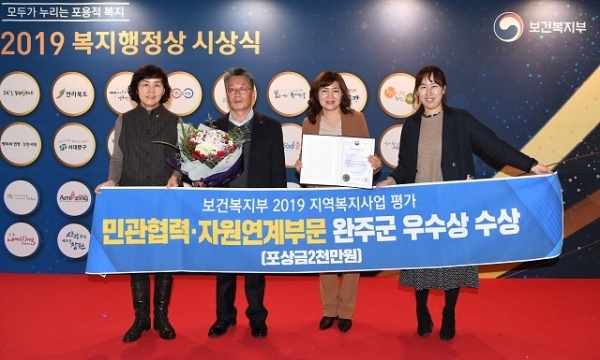완주군이 보건복지부 주관 2019 지역복지사업평가에서 ‘민관협력 및 자원연계분야’ 우수 지자체로 선정돼 포상금 2000만 원을 받았다.