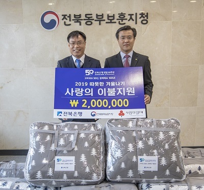 JB금융그룹 전북은행(은행장 임용택)은 11일 전북동부보훈지청(지청장 주영생)과 함께 ‘2019 따뜻한 겨울나기 사랑의 이불 나눔’ 전달식을 가졌다.