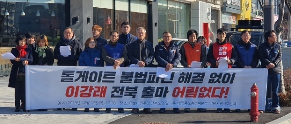 전국민주노동조합총연맹 전북지역본부는 12일 더불어민주당 전북도당 앞에서 기자회견을 열고 “이강래 사장은 톨게이트 불법 파견 해결 없이 전북 출마는 어림없다”고 주장했다.