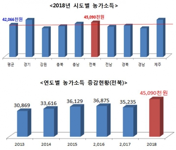 전북 농가전체 평균소득 또한 지난 2017년 전국 9위에 머물렀지만, 2018년 여섯 계단 상승한 3위를 기록했다. 올해 전북 농가 소득은 더 높아질 것으로 전망된다.