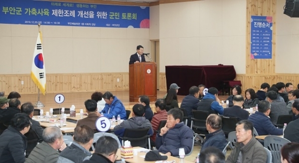 부안군은 지난 20일 부안예술회관 1층 다목적강당에서 군민 150여명이 참석한 가운데 부안군 가축사육 제한 조례 개선을 위한 토론회를 개최했다. 이번 토론회는 금년 2월 18일자로 강화된 가축사육 거리제한(소, 젖소, 말, 사슴 등)으로 인한 축산농가의 애로사항과 축사 인근 주민의 생활환경에 관한 합의점을 찾기 위해 마련됐다.토론회는 군민에 한해 가축사육 거리제한 완화가 필요한가에 대한 주제와 축사를 신축 또는 증축하기 위해 주민동의가 필요한데 이 과정에서 발생하는 문제점에 대한 개선방안을 찾기 위한 주제로 구성됐다.