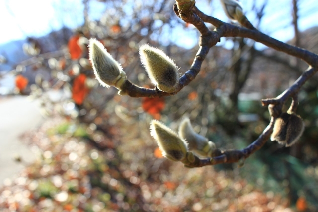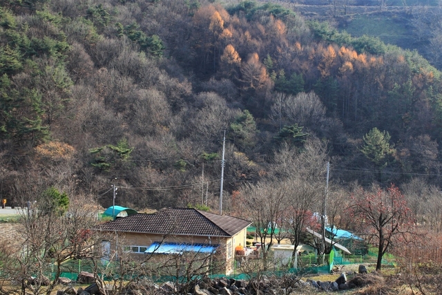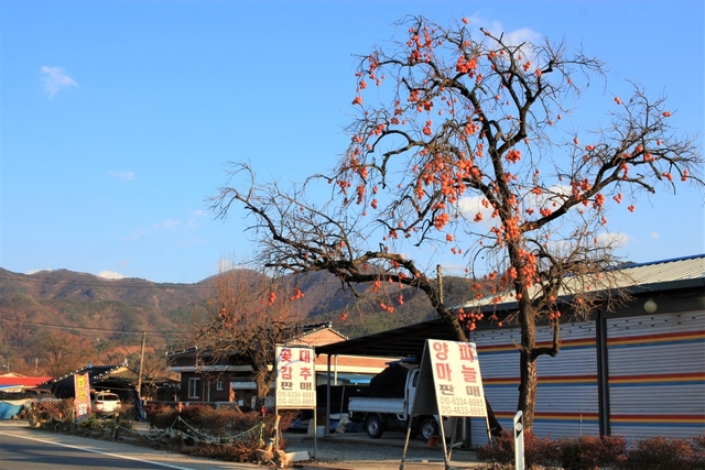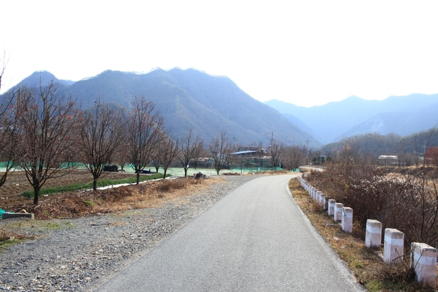 경천애인 농촌사랑학교를 지나 마을길로 들어서면 운문골 마실길이 본격적으로 시작됩니다. 둘레길이 지나는 마을에는 집들이 드문드문 떨어져 있습니다. 조용하기 그지없습니다. 경천면은 전통적으로 대추가 유명한 지역인데 요즘은 감 재배가 점차 늘어가고 있습니다. 길가에 늘어선 감나무는 수확을 끝낸 상태라 텅 빈 모습입니다. 그것과는 대조적으로 목련 한 그루 풍성한 모습으로 벌써 봄을 준비하고 있습니다.