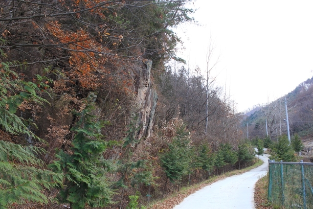 사방댐 위쪽 계곡 옆에는 지난번 왔을 때 없었던 집이 한 채 들어섰네요. 그 앞산에는 특별한 바위가 보입니다. 마을 주민 이야기로는 평소에는 물이 보이지 않지만, 비가 오면 바위 위에서 물이 폭포수처럼 흘러내려 장관을 이룬답니다. 그래서 마을 사람들은 ‘낙수 바위’라 부릅니다. 예전에는 바위 위에 절이 있었는데 불타 없어져 지금은 볼 수 없습니다.