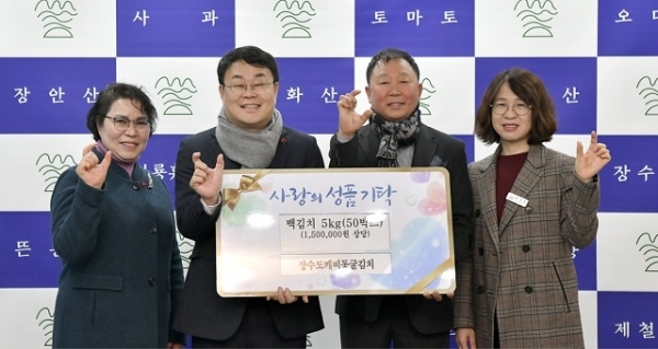 장영수 군수는 “관내 도움이 필요한 이웃들을 위해 김치를 기탁해주셔서 감사드린다”며 “보내주신 따뜻한 나눔의 마음을 어려운 이웃들에게 전달하여 더욱 더 따스한 지역사회가 될 수 있도록 노력하겠다”고 말했다.