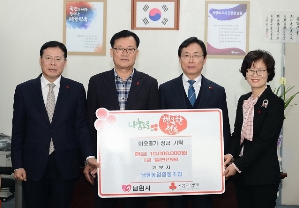 남원농협(조합장 박기열)은 지난 24일 소외된 이웃을 위해 써 달라며 남원시에 성금 1000만원을 맡겼다.