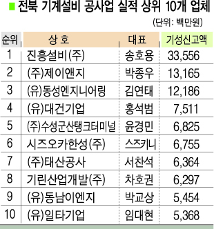 진흥설비(주)가 지난 해 335억5680만5000원으로 전년에 이어 도내 257개 기계설비건설업체들 가운데 기성실적 1위를 차지했고 (주)제이앤지가 131억 6542만4000원으로 전년 3위에서 2위로 한 계단 뛰어올랐다.
