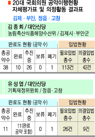 또 이들은 20대 국회의원 공약이행현황 자체평가와 실제 공약이행 비율이 거의 일치했다. 두 지역구의 공통현안인 부창대교 건설은 고창을 지역구로 둔 유 의원만 내걸었다.