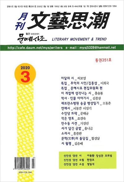 한편 월간 <문예사조> 는 서울 ‘문예사조사’가 1990년에 창간한 종합 문예지로 그동안 전국적으로 역량 있는 문인들을 배출했다. 이번 2020년 3월호는 통권 351호다. 문예사조>