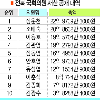 총액 기준으로 보면 정운천 의원이 22억9739만3000원으로 가장 많았고, 조배숙 의원 20억8632만5000원, 이용호 의원 19억5704만8000원, 김관영 의원 19억2793만9000원, 정동영 의원은 16억4956만4000원, 안호영 의원 12억9733만5000원, 유성엽 의원 12억1534만9000원, 이춘석 의원 8억724만6000원, 김종회 의원 7억8172만9000원, 김광수 의원 3억8288만4000원 순이다.