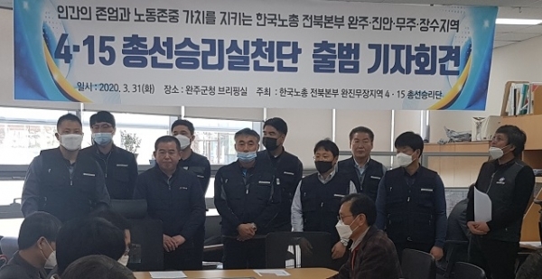 한국노총 전북지역본부 완주진안무주장수지역 4·15총선 승리 실천단(이하 실천단, 단장 최한식)이 31일 완주군청 브리핑룸에서 기자회견을 갖고 “한국노총과 더불어민주당은 지난 3월10일 공동협약을 체결, 인간의 존엄과 노동존중의 가치를 지키는 노동존중 5대 비전·20대 공동약속의 실현을 위해 공동의 노력을 다할 것을 약속했다.”며 “실천단은 공동약속 실천을 위해 함께 노력할 것을 약속한 안호영 후보를 지지하며 총선 승리를 위해 최선의 노력을 다하겠다.”고 밝혔다.