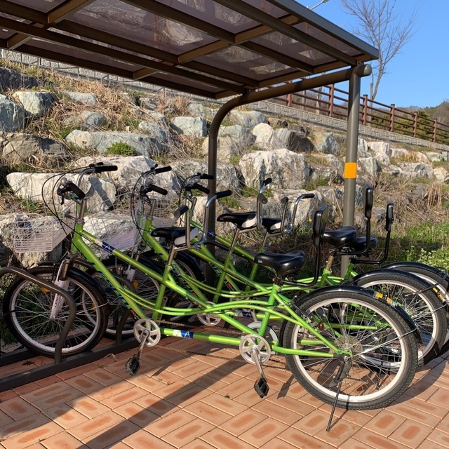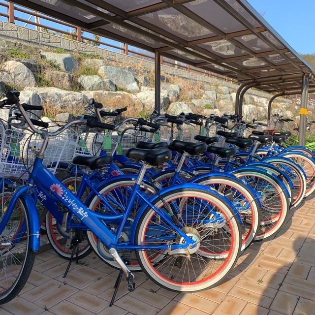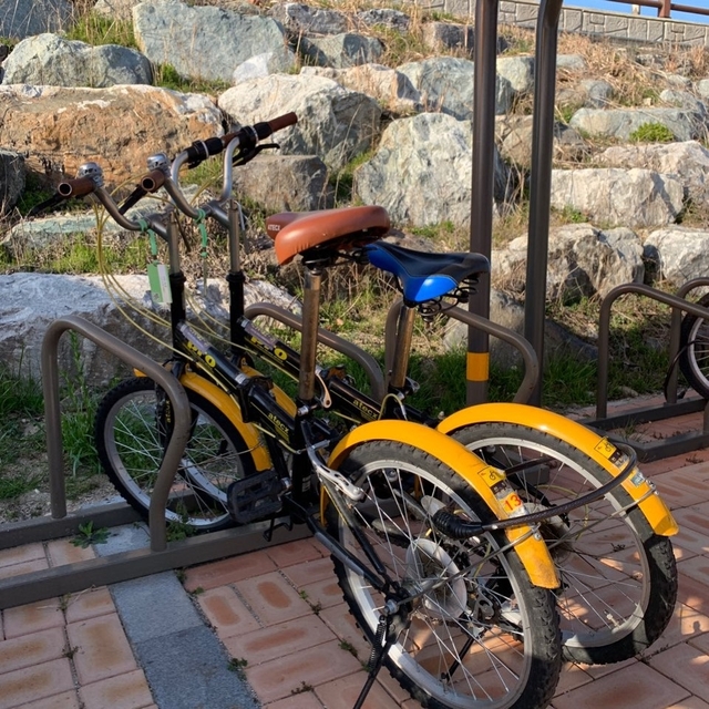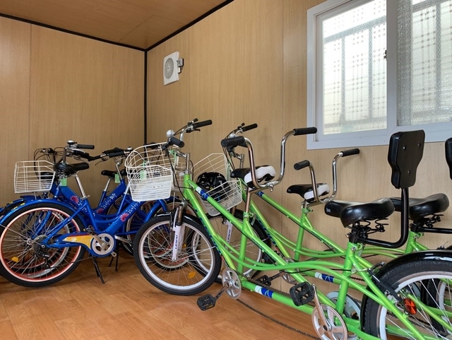 또한, 사진에 보이는 것처럼 일반용 자전거(파란색), 2인용 자전거(초록색)이 대여 가능하며 이곳에 없지만, 유아용(노란색) 자전거도 대여할 수 있다고 합니다.