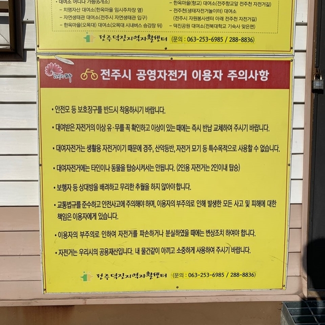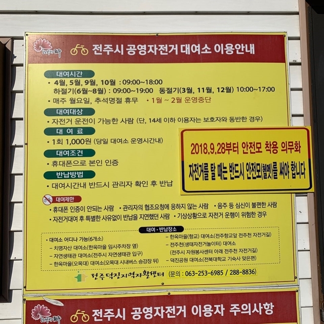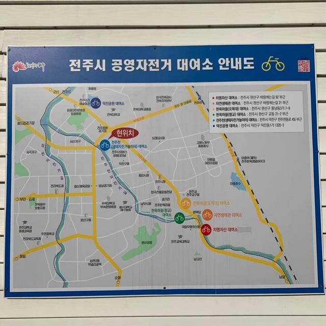 자전거 대여소는 덕진공원, 전주천 생태 자전거놀이터, 한옥마을 향교, 오목대, 자연생태관, 치명자산 부근에 각각 있으므로 꼭 자전거를 대여한 곳에서 반납하지 않아도 됩니다. 이 외에도 전주시의 발표에 의하면 삼천동 부근과 송천동 부근에도 자전거 대여소를 만들 계획이라고 전해 다양한 곳에서 대여할 수 있을 것 같아요.