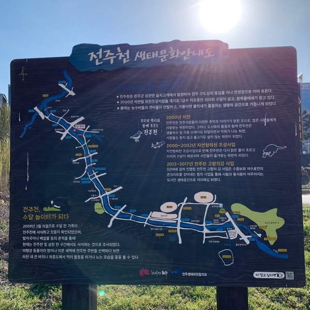 2000년부터 2년간 자연형 하천 조성사업으로 맑은 물에서만 산다는 쉬리와 수달이 전주천을 찾았습니다. 그뿐만 아니라 2012년부터 7년간 진행된 전주천 고양의 강 사업으로 시민들이 여가생활을 더욱 편히 즐길 수 있도록 하천과 그 주변부를 정비했습니다. 그 때문인지 자전거 길은 움푹 패어있거나 크게 균열이 가있는 부분 없이 매끄럽고 쾌적했습니다.