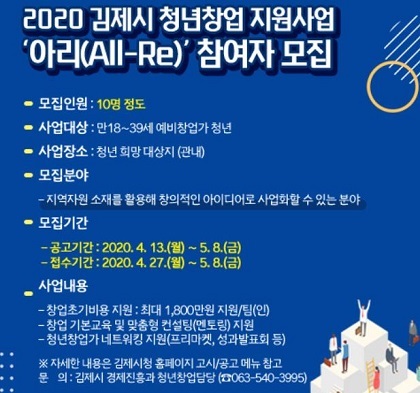 김제시가 지역 청년창업을 응원하는 ‘2020 아리(all-re)’사업을 추진한다.
