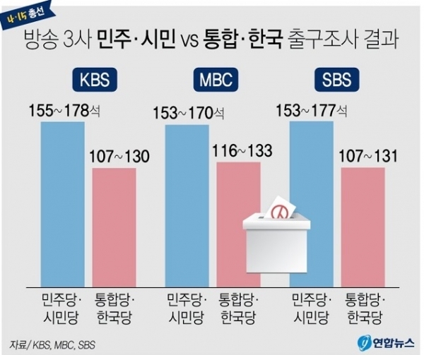 MBC는 민주당과 시민당이 153~170석, 통합당과 한국당은 116~133석을 확보할 것으로 전망했고, SBS는 민주당과 시민당 154~177석, 통합당과 한국당 107~131석을 얻을 것으로 분석했다.