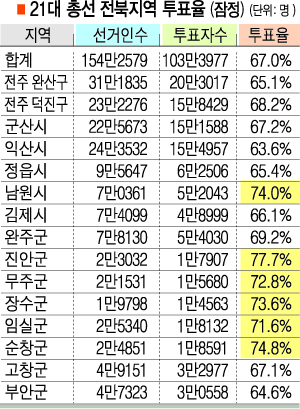 15일 중앙선거관리위원회에 따르면 21대 총선의 전북지역 유권자는 154만2579명이다. 이 중 실제 투표에 참여한 유권자는 103만3977명으로 평균 투표율은 67.0%로 집계됐다.(사전투표 포함)