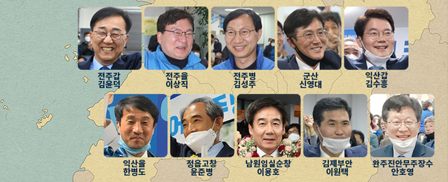 15일 오후 11시 현재 당선이 확정된 후보자는 전주갑 김윤덕, 전주을 이상직, 전주병 김성주, 군산 신영대, 익산갑 김수흥, 익산을 한병도, 정읍고창 윤준병, 김제부안 이원택, 완주진안무주장수 안호영(이상 민주당), 남원임실순창 이용호(무소속) 후보다.