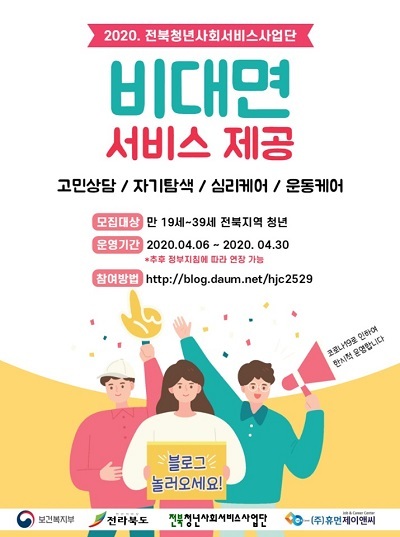 전북청년사회서비스사업단(단장 유미옥)은 22일 코로나19 확산으로 인해 바깥 활동이 어려워진 전북지역 청년(만19세~39세)들의 심리적 불안을 해소하고 신체 건강을 도모하기 위해 온라인을 통한 ‘비대면 서비스’를 제공한다고 밝혔다.