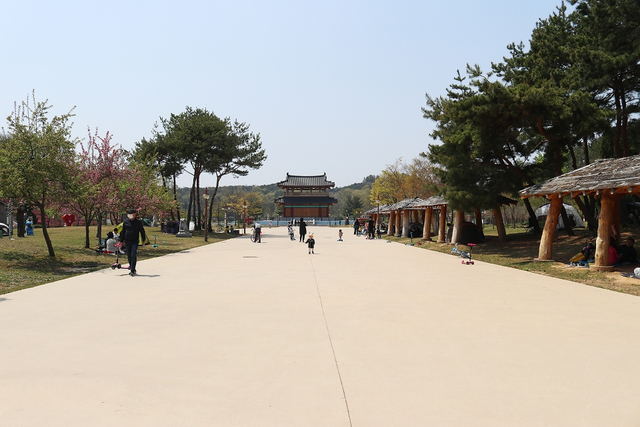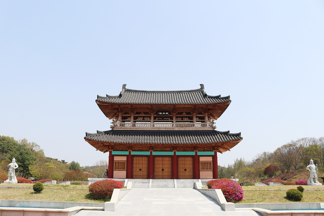 중앙광장을 지나면 정면에 무왕루가 자리잡고 있습니다. 무왕루는 익산 서동축제 때마다 무왕이 익산으로의 천도를 알리는 군사들의 퍼포먼스 장소로 활용되고 있는데요. 백제 전통양식을 따른 익산 제1호 건축물인 무왕루는 양옆의 동상들과 함께 백제의 미를 웅장하게 뿜어내고 있습니다.