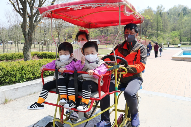 2인용 자전거 앞좌석에 보조석이 있는 4인용 자전거가 눈에 띄었는데요. 아직 자전거를 탈 수 없는 어린아이를 앞에 앉히고 부모님들이 페달을 밟아 달릴 수 있어 어린 자녀와 함께 나들이 나온 부모님들께 인기가 많았습니다. 코로나19 바이러스의 영향으로 온 가족이 마스크를 하고 있어 밝게 웃는 미소는 가려졌지만, 아이의 눈빛은 여전히 사랑스럽기만 합니다.
