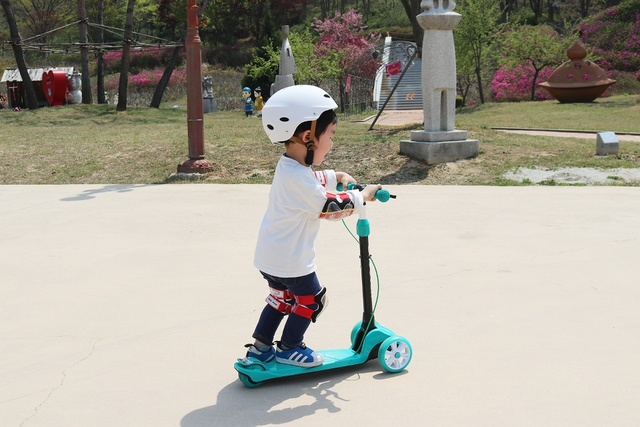 아직 자전거를 타기에 어린아이들은 집에서 각자 챙겨온 퀵보드 삼매경에 빠졌는데요. 이 아이는 이날 퀵보드를 처음 타보는 거라 안전장비도 모두 잘 갖춘 상태에서 아버님께서 계속 지켜보며 퀵보드에 탑승했습니다. 단란한 부자의 모습이 따사로운 봄 햇살보다 더 포근하게 느껴지는 순간이었습니다.
