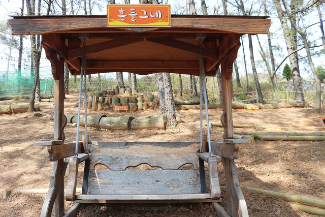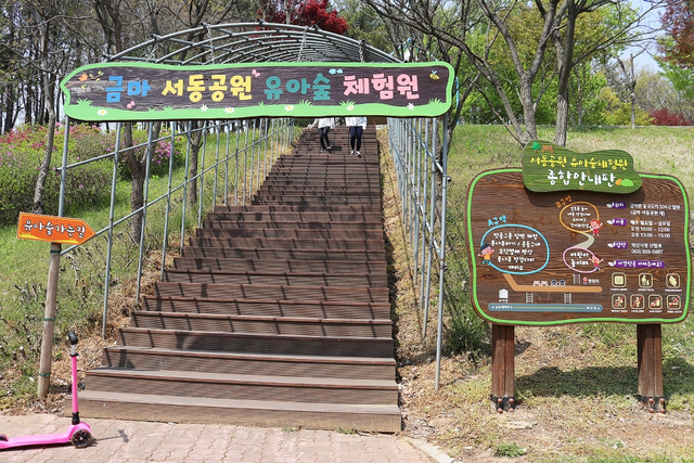 서동공원에는 아이들이 체력 단련하기에 좋은 유아숲 체험원이 꾸며져 있는데요. 유아숲 체험원은 크게 A구역과 B구역 그리고 어린이놀이터로 구분되어 있습니다. 어린이놀이터에는 그네, 미끄럼틀 등이 있고 B구역에는 실로폰 놀이, 네 줄 징검다리 등의 나무 조형물을 통해 신나는 놀이를 즐길 수 있습니다.