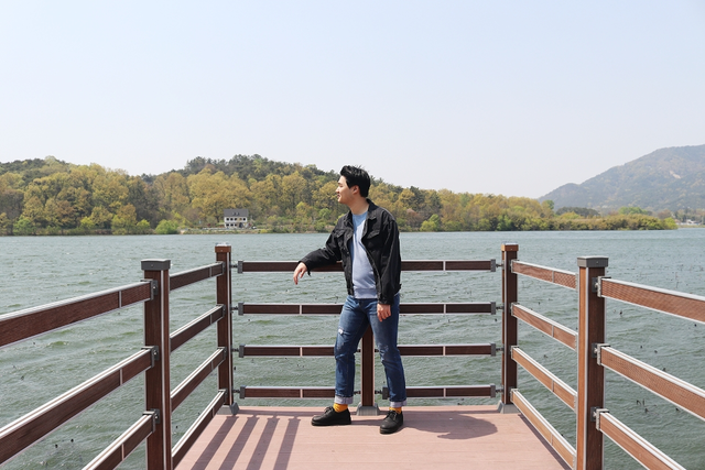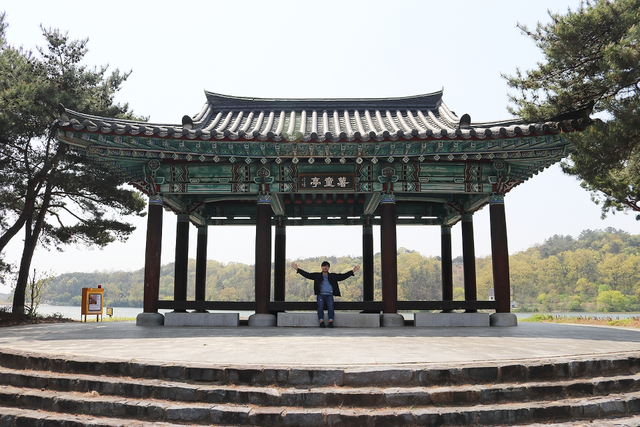 금마저수지 산책을 마치고 다시 서동공원을 거닐다 저수지 앞 푸른 저수지 배경으로 멋진 사진을 남길 수 있는 작은 누각이 있어 두 팔을 활짝 벌려 사진을 찍었습니다.