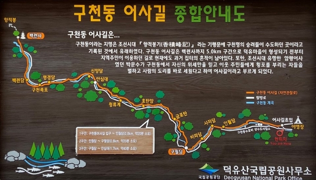 구천동 어사길은 왕복 13km, 3~4시간 정도 소요되는 길로써 코스에는 오르막길이 거의 없어 등산에 미숙하신 분도 쉽게 자연을 느끼실 수 있습니다. 계곡 옆에 조성된 길만 따라가도 인월담, 구월담, 안심대 등 18곳의 아름다운 경치를 볼 수 있습니다.