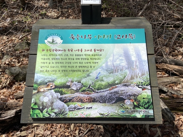 1구간의 특징이라고 한다면 코스 곳곳마다 안내판이 배치되어 있어 자연에 관한 공부를 하실 수 있다는 점입니다. 아이들과 함께 걸으면서 다람쥐도 찾아보고 자연이 우리에게 얼마나 소중하고 중요한 보물인지 환경보호를 실천하게 하여 줍니다.