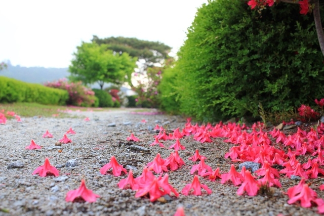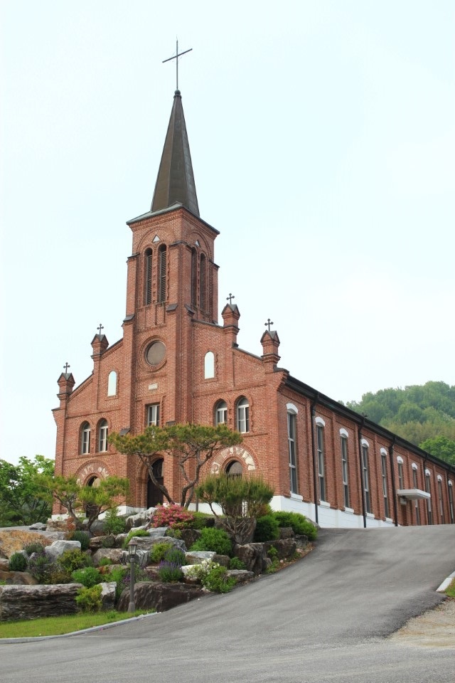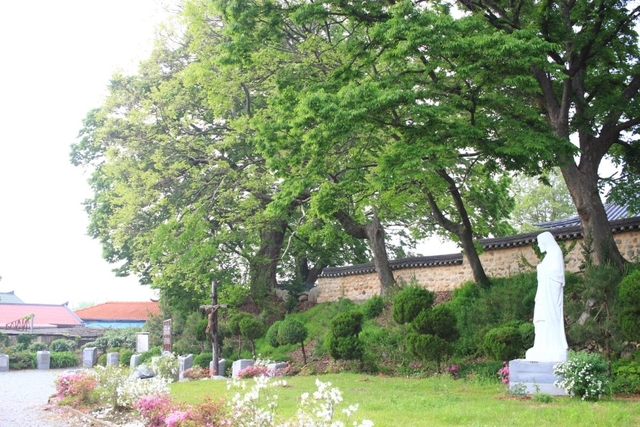 여산 성당을 나와 다음에 찾아간 곳은 불의 순교지로 부르는 숲정이 성지입니다. 성지로 들어가는 입구에는 붉은색 철쭉꽃이 떨어져 길을 붉게 물들였습니다. 박해 당시 이곳에서는 신자들이 참수형을 당했는데 떨어진 꽃잎을 보면서 순교자들을 떠올렸습니다.