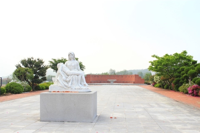 숲정이 성지는 전라북도 기념물 제125호입니다. 성지로 들어서면 피에타상과 마주합니다. 피에타상은 성모 마리아가 죽은 그리스도를 안고 있는 모습을 조각한 작품을 말하는데요. 이 피에타 상이 모든 것을 설명해 주고 있습니다.