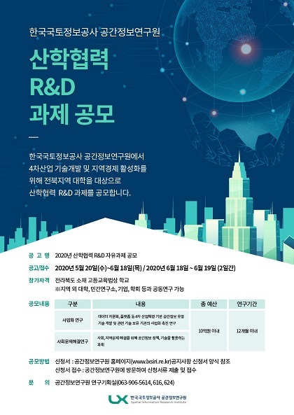 LX공간정보연구원(원장 김현곤)이 10억 원 규모의 ‘산학협력 R&D 자유 과제’를 전북지역 대학을 중심으로 공모한다고 21일 밝혔다.