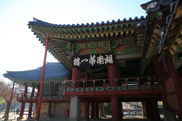 당당하게 호남 제일루라고 현판을 걸어놓을 정도로 그 위세가 남다른 건물입니다. 광한루의 전·후면에는 호남 제일루(湖南第一樓)·계관(桂觀)·광한루의 현판이 걸려 있으며, 새로 마련한 남쪽 정문 문루에는 청허부(淸虛府)의 현판이 걸려 있습니다.