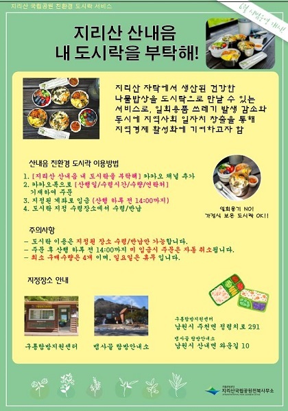 국립공원공단 지리산국립공원전북사무소(소장 김효진)는 “국립공원 친환경 도시락 서비스를 운영한다”고 8일 밝혔다.