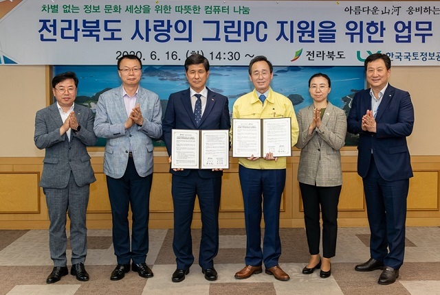 LX는 16일 전북도청에서 ‘사랑의 그린PC 지원을 위한 업무협약’을 전라북도와 체결하고 향후 3년간 일정량의 정보통신매체를 무료 제공하기로 했다.